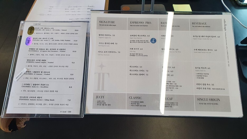 기분 좋게 아점을 먹고 간 곳은 커피 템플입니다. 짝꿍이 가고 싶어 하던 곳이라 저도 따라갔는데 저도 가끔 커피 관련 유튜브를 시청하는데 유튜브에서 보던 분을 뵐 수 있어서 색다른 경험이었습니다.에스프레소, 플렛화이트, 텐저린 카푸치노 3가지를 시켰습니다. 설명을 너무 잘해주셔서 주문할 때 큰 도움이 되었습니다. 밖에 있는 테이블에 앉아 기다리고 있으면 직원분께서 가져다주십니다. (자리 옮기다가 흘려버린 플렛화이트) 가져다주실 때도 설명을 해주시는데 에스프레소에 관련하여 설명을 많이 해주십니다. 마시는 순서, 방법, 에스프레소 잔에 대한 설명 등 친절하고 자세하게 설명을 해주셔서 이해하는데 도움이 많이 되었습니다.