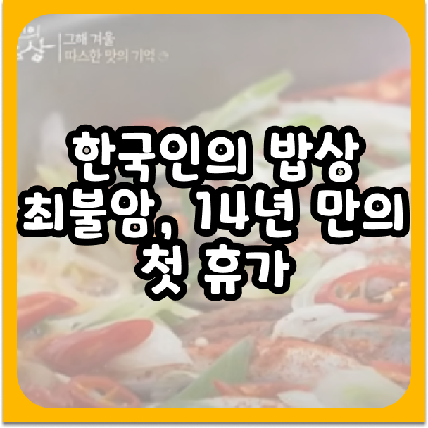 KBS 1TV의 대표 프로그램 '한국인의 밥상'은 14년 동안 한국의 다양한 음식 문화를 소개하며 많은 사랑을 받아왔습니다. 이 프로그램의 상징과도 같은 배우 최불암 씨는 따뜻한 목소리와 진정성 있는 내레이션으로 전국의 시청자들에게 깊은 감동을 선사해왔습니다. 하지만 2024년, 방송 시작 이후 처음으로 최불암 씨가 잠시 휴가를 떠난다는 소식이 전해지며 큰 화제가 되고 있습니다.