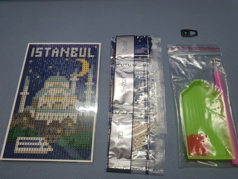 구성품은 접착풀이 발라져 있는 도안, 여러 가지 색색의 비즈, 고체풀을 이용해 비즈를 붙여야 하는 펜, 비즈 그릇이 될 트레이, 고체풀로 이루어져 있습니다.