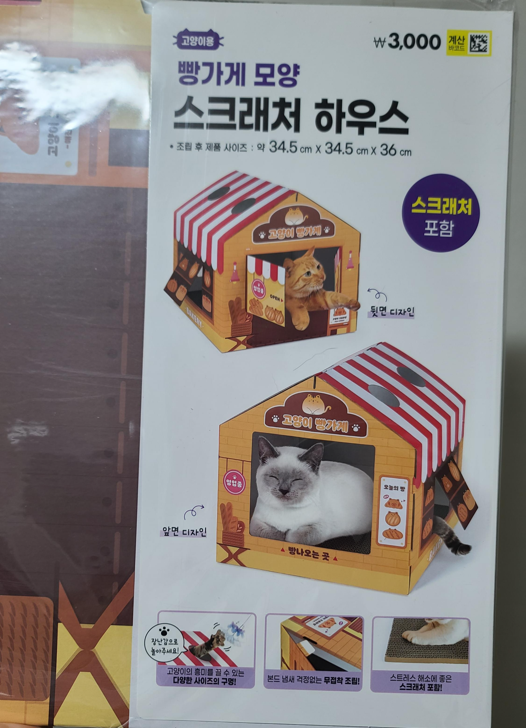 - 특징: 빵가게 컨셉의 디자인, 골판지 스크래처 내장, 조립식 구조
