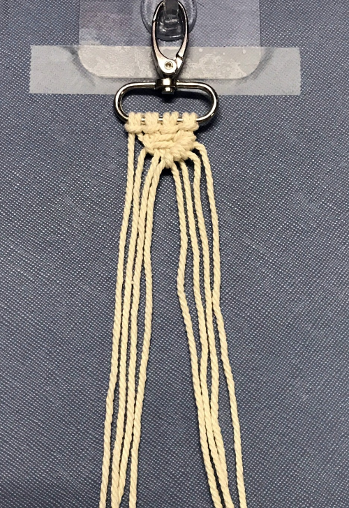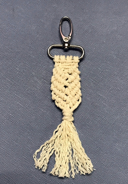 천천히 따라 하다 보면 이렇게 마크라메 키링이 만들어집니다. 저 같은 경우는 유튜브를 보면서 했는데 30분 정도 걸린 거 같네요. 긴 시간이 걸리지 않고 이렇게 간단하게 키링이 만들어집니다.만들어집니다. 이런 분들에게 추천해드립니다. 첫 번째, 마크라메를 경험하고 싶으신 분 두 번째, 짧은 시간을 들여 결과물을 빨리 보고 싶으신 분 세 번째, 손이 심심하신 분