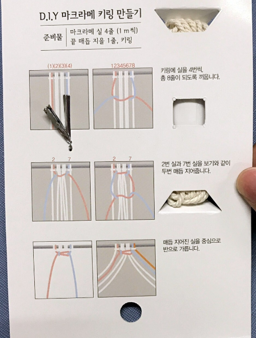 사용연령은 만 14세 이상이고 구성품은구성품은 약 5m 길이의 실과 키링으로 구성되어있습니다. 포장을 제거하고 종이 안쪽을 확인하면 설명서를 찾을 수 있습니다. 설명서에는 실색이 색으로 구분하여 설명이 되어있어 처음 마크라메를 접하는 초보자도 천천히 따라 하기 쉽게 되어있습니다. 그리고 키링의 경우는 작기 때문에 총 작업 소요시간이 길지가 않습니다.