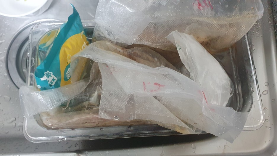 10시간의 시간이 지나고 바로 먹을 것이 아니어서 냉장고에 넣기 위해 칠링을 해줬습니다. 아이스팩을 이용해서 30분 정도 진행해 주었습니다.