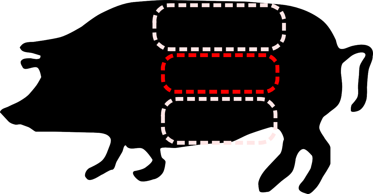 스페어립은 돼지 내장 쪽에 가까운 갈비라고 합니다. 그림에서 빨간 점선으로 그려져 있는 부분이 스페어립이 위치한 자리라고 합니다. 위로는 등갈비가 있고 아래로는 우리가 즐겨먹는 삼겹살 부위입니다. 삼겹살과 가까운 위치라 그런지 지방이 많이 있네요.