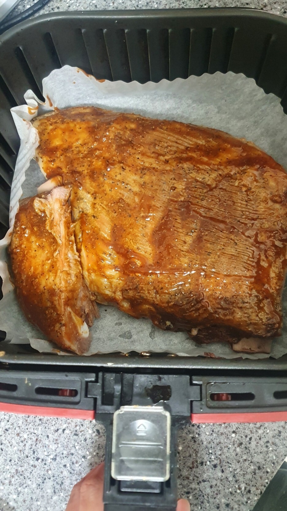 소스를 스페어립에 발라주고 1차 170도 10분 돌려주고 다시 한 번 더 소스를 발라 2차로 170도 10분을 돌려줍니다.