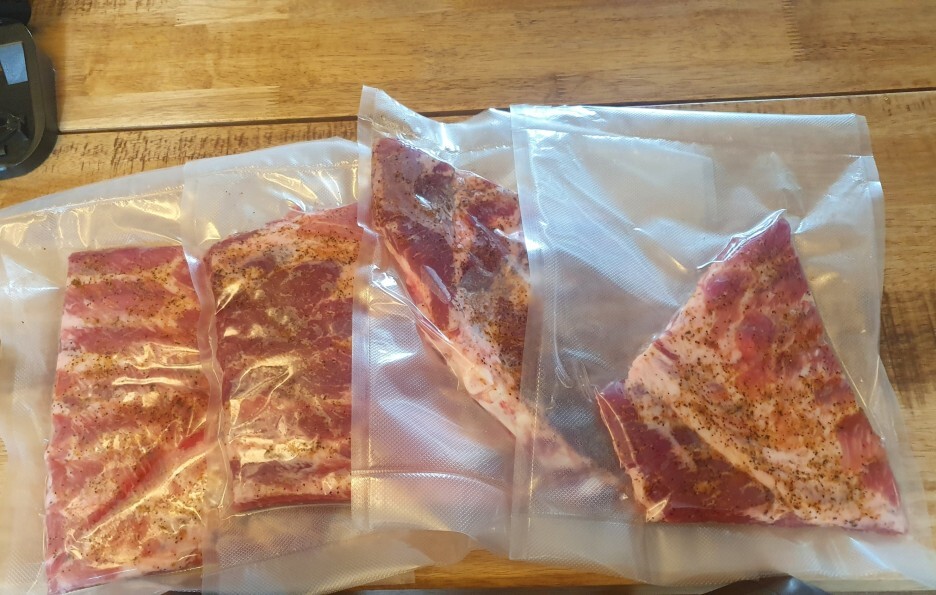 시즈닝을 고기 앞뒤로 발라주고 진공포장을 해줍니다. 고온으로 장시간 수비드를 계획하고 있기 때문에 이중으로 포장했습니다.(두 번째 포장은 진공포장 하지 않았습니다.)