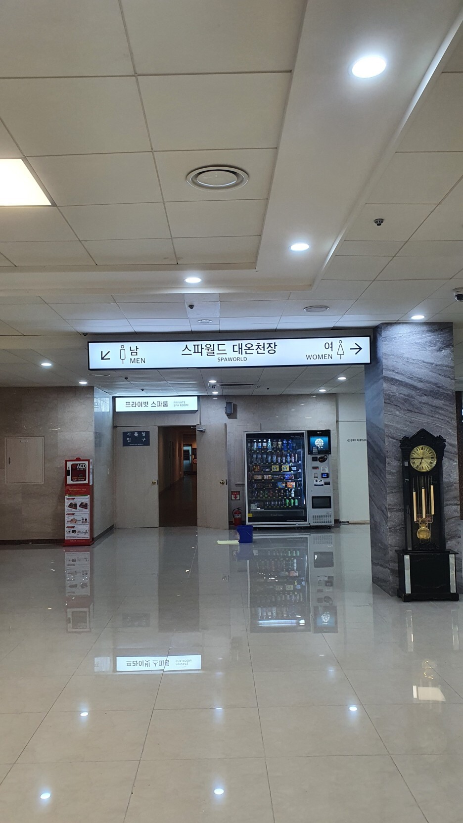 계단을 내려가서 입구를 통해 입장을 하면 정면에 매표소가 보입니다. 그리고 미처 준비 못 한 이태리타월 등 목욕용품이 있다면 자판기를 통해서 구입을 할 수 있습니다. 현금뿐만 아니라 카드도 가능해서 걱정 안 하셔도 될 거 같습니다. 그리고 매표소에 가서 입장권을 구입을 하면 되는데 현장 구매가 아닌 인터넷으로 입장권을 구입했다면 매표소 카운터가 아닌 매표소 앞 기둥 뒤에 있는 모바일 매표소에 예매할 때 받은 바코드를 이용하여 입장권을 발급받을 수가 있습니다.