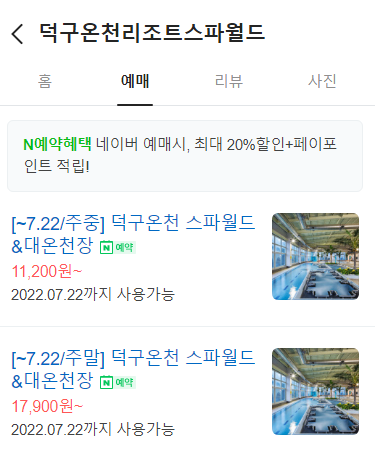 네이버 예약을 하면 조금 더 저렴한 금액으로 예약이 가능한데요. 표시되어 있는 11,200원의 가격은 소인 기준의 금액이고 성인의 경우에는 15,700원으로 저렴하게 이용할 수가 있습니다. 그리고 호텔이나 콘도에 숙박하는 경우에는 50% 할인권을 1인당 한 장씩 제공하기 때문에 조금 더 저렴하게 이용할 수가 있습니다.