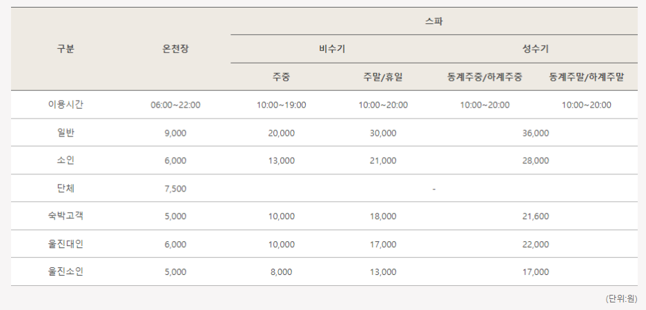 이용요금과 이용 시간은 위와 같습니다. 성수기/비수기, 주중/주말별로 금액과 이용시간이 다르기 때문에 미리 확인이 필요합니다.