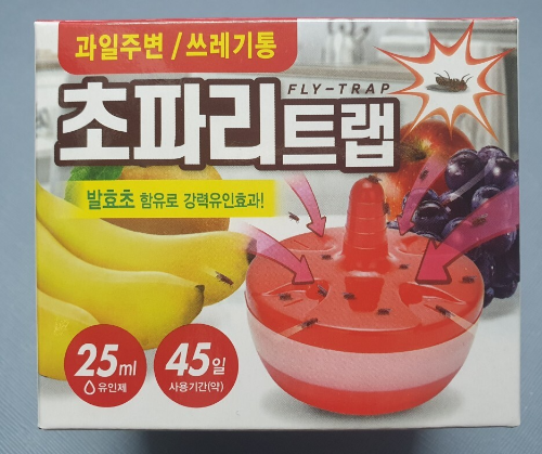 여름철은 많은 벌레때문에 고통을 받는 계절합니다. 특히나 초파리같이 작은 벌레들은 큰벌레만큼이나 스트레스의 원인이 됩니다. 식물 주변에도, 음식물 쓰레기 주변에도, 과일주변에도 작은 벌레가 항상 느낌이라 고통 한번 구입을 해봤습니다.초파리 트랩입니다. 인터넷을 검색을 해보면 간편하게 집에서 트랩을 만들 수 있는 방법도 존재합니다만 재료가 마땅치 않거나 좀더 손쉬움 방법을 찾는 분들이 계시지 않을까 생각에 제품을 구매를 해봤습니다. 구성품으로는 붉은색으로 이루어져있는 25ml의 유인제와 플라스틱 전용 용기가 들어있으며 사용기간은 약 45일 이라고 합니다. 유인제의 냄새를 살짝 맡아봤는데 살짝 새콤하면서 달콤한 냄새가 납니다. 핸드메이드로 만들때도 식초등이 들어 가는데 같은 원리인거 같습니다.
