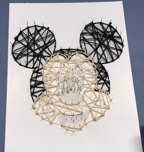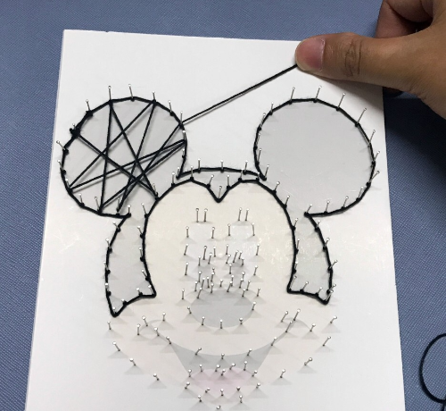 특별한 규칙 없이 계속 이어 주면조금씩 조금씩 우리가 아는 모양이 드러납니다. 진행을 하면서 경험하게 된주의할 점이 몇 가지가 생겼습니다. 첫 번째는핀과 핀을 연결하다 보면 실이 은근히 잘 풀립니다. 핀을 이을 때마다 매듭을 짓는 것이 아니라 감는 형식으로 진행을 하니까 잘 풀립니다. 그래서 중간중간 매듭을 지으면서 진행을 하였는데 이게 한두 번이면 괜찮은데 반복되면화납니다. 화가 좀 나요. 던지고 싶을 만큼 두 번째, 도안을 보면 핀이 촘촘하게 박혀있는 부분들이 있습니다.(지금 도안의 경우 눈과 코, 입) 이렇게 핀 이 촘촘하게 있는 부분은 손이 잘 안 들어가집니다. 어린이 손정 도면 모르겠습니다만 일반 성인 분이면 다른 보조기구가 필요하지 않을까 생각해봅니다.(핀셋이라던지)