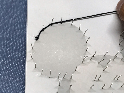 두 번째, 이제 실을 이용해서 핀과 핀 사이를 이어주면 되는데요. 시작점이 될 핀에 매듭을 지어 묶어준 상태로 인접해 있는 핀을 감아 이어주는 형태로 진행을 해주면 됩니다. 쉬워 보이는 작업이었는데 은근히 힘들었습니다. 저 같은 경우는 테두리가 되는 부분을 밑그림 그리듯 먼저 이어준 후 안쪽을 채워나가는 식으로 진행을 하였습니다. 같은 방식으로 다른 색상의 실도 진행을 해나가면 됩니다.(은근 힘이 듭니다. 조금 현타가 올 때도 있습니다. 이걸 왜 하고 있나 하는 그런 생각)