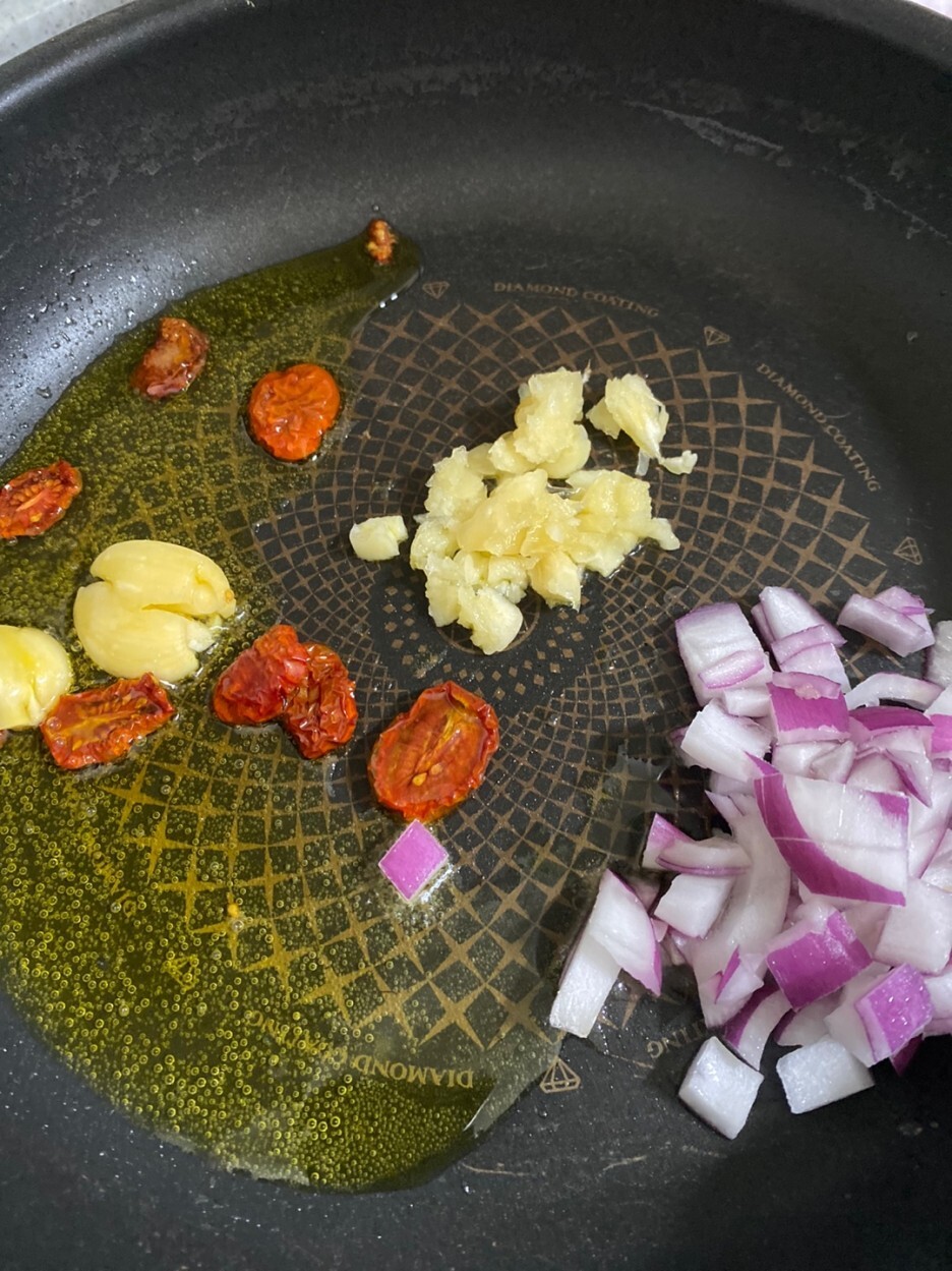 선드라이드토마토에 있는 말려진 토마토와 마늘, 올리브를 넣고 양파와 다진 마늘을 같이 볶아 줍니다.