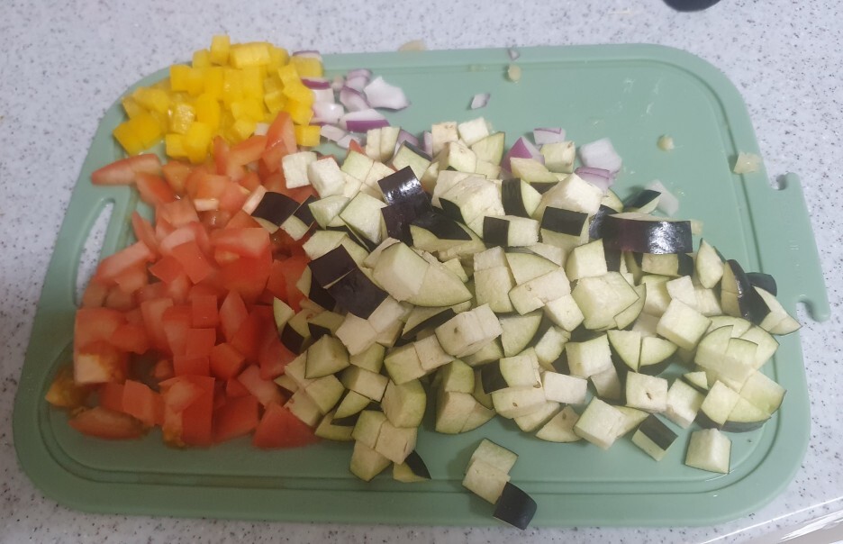 같이 넣을 채소는 파프리카 반개, 토마토 1개, 가지 1개, 양파 반 개를 큐브 형태로 잘라서 준비를 해놨습니다.