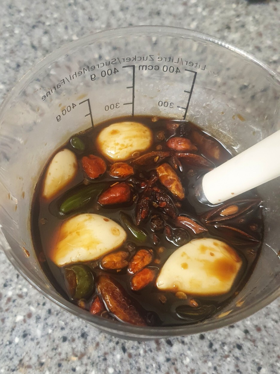 간장 200ml, 쌀엿 200ml 미림 100ml 노추 50ml 팔각3개 마늘 6개 이상, 페페론치노6~7개, 통후추, 청양고추 2개, 생강(800g 기준)