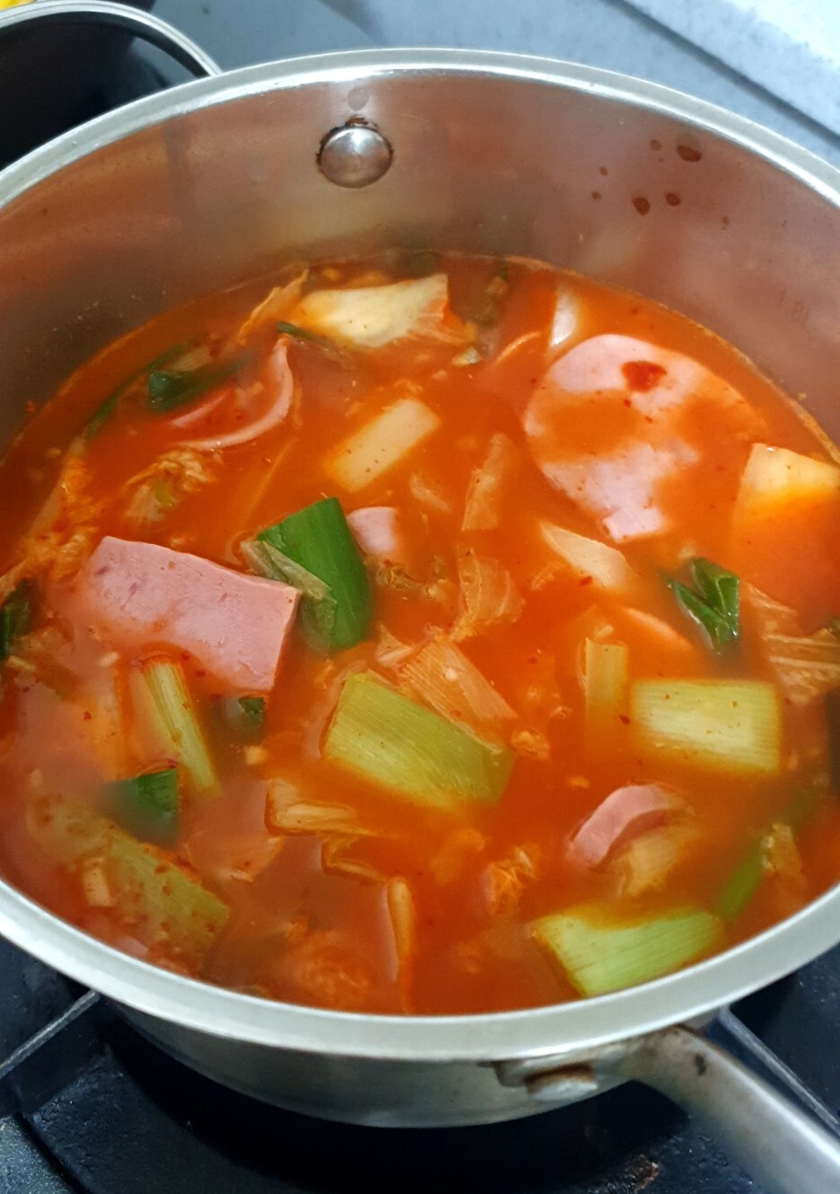 한번 끓고 난 뒤의 부대찌개인데요. 치즈와 사골육수가 들어가서 진한 맛이 좋았고 햄의 양도 생각보다 넉넉해서 두 명이서 충분히 잘 먹을 수 있었습니다. 부대찌개에는 사리를 빼놓을 수 없는데 라면사리도 구성품에 포함되어 있기 때문에 만족스러웠습니다. 다만 김치 맛이 많이 나서 김치양을 조절해서 넣으시면 좋으실 거 같아요.