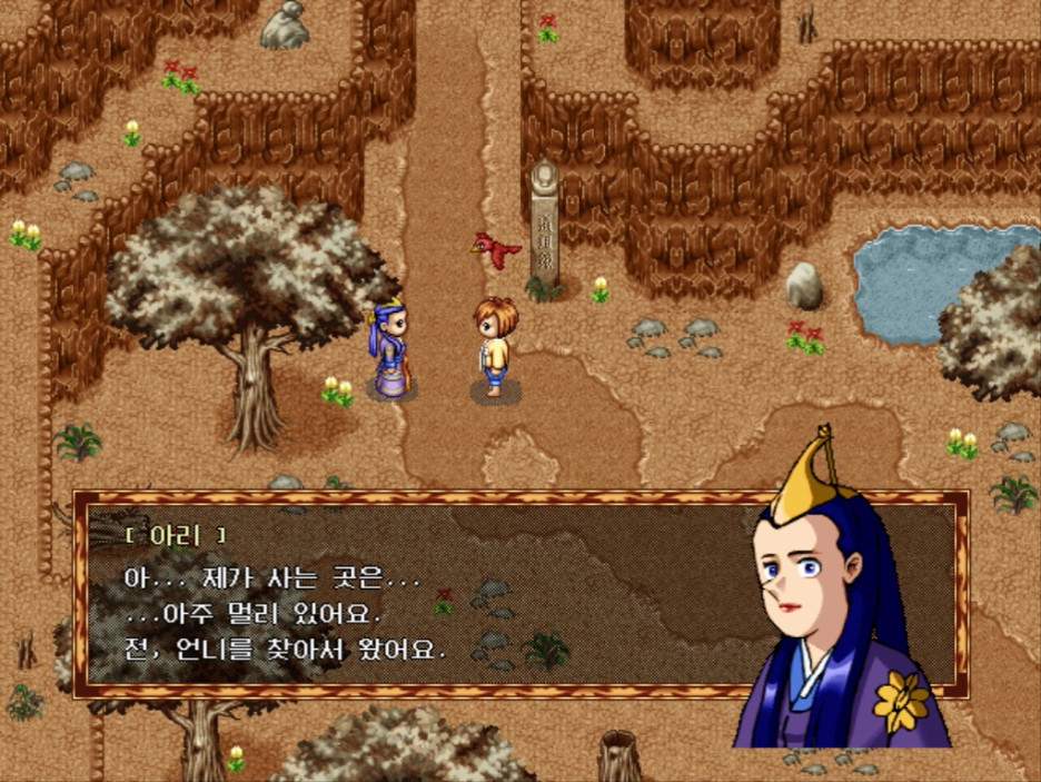 집을 뛰쳐나와 길에서 한 여인을 만나게 되는데 이 게임의 다른 주인공인 아리입니다. 머털은 난처한 상황임을 알고는 목적지까지 같이 동행을 하기로 합니다. 처음 보는 사람을 도와주는 머털이 착하네요.