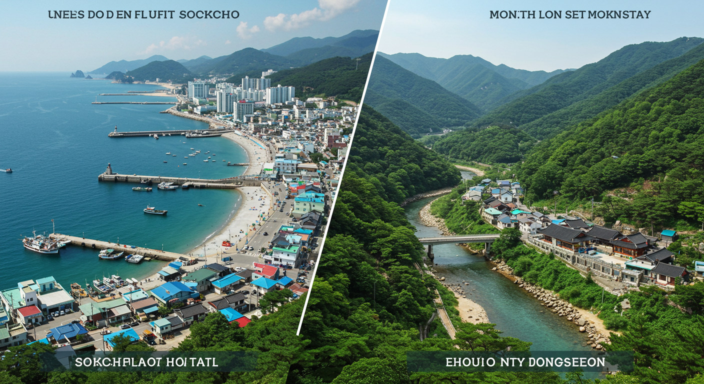 속초는 바다와 산이 함께하는 곳으로, 설악산 국립공원과 동명항, 속초해수욕장 등 관광지와 맛집이 잘 갖춰져 있습니다. 반면 정선은 조용한 산골 분위기에서의 느린 삶이 매력적이며, 정선아리랑시장과 레일바이크, 가리왕산 등 자연 친화적인 체험이 가능합니다.