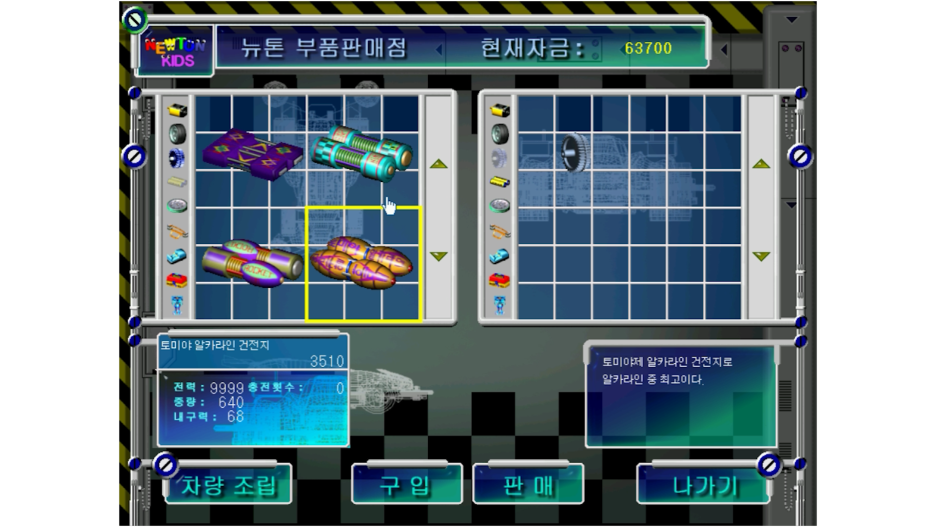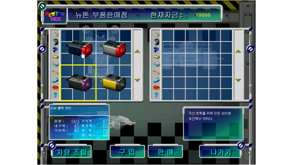 조립을 위해 부품 판매점에 들러봅니다. 초기 자금은 7만 원을 주는데요. 번개돌이 레이싱카에는 만 원밖에 안 줬었는데 이 게임은 넉넉하게 주는 거 같습니다.