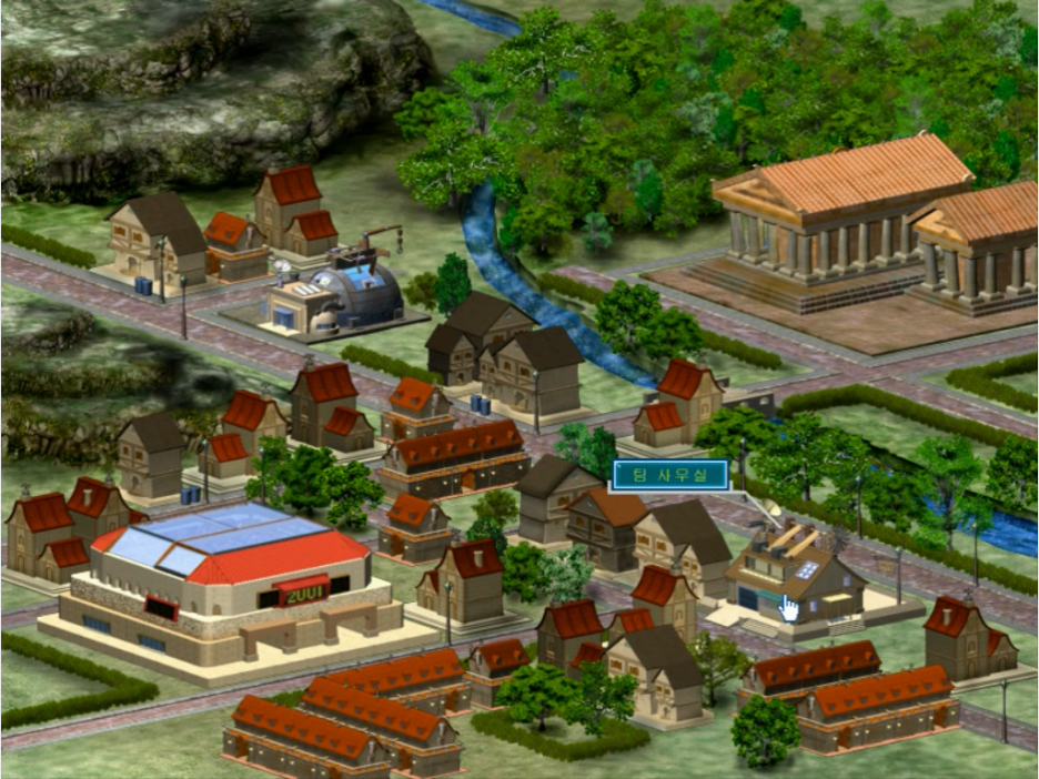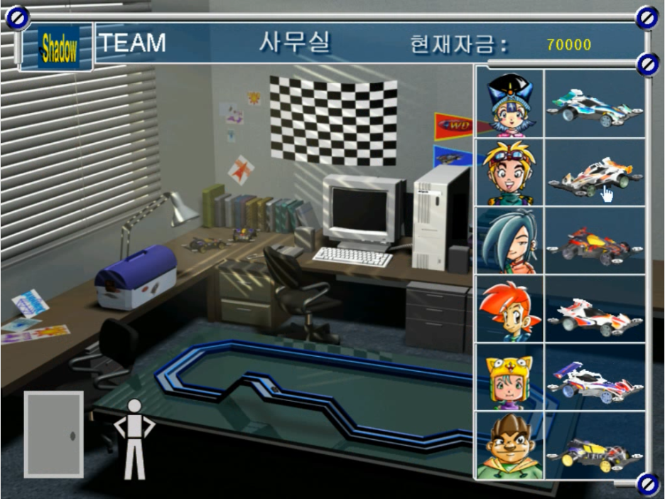 들어가면 마을 전경이 나오고 곳곳에 팀 사무실과 부품 판매점, 경기장이 있습니다. 뭐가 많이 보이는 배경이지만 실제로 이용할 수 있는 곳은 네 곳 남짓입니다. 일단 팀 사무실부터 들어가 봅니다.