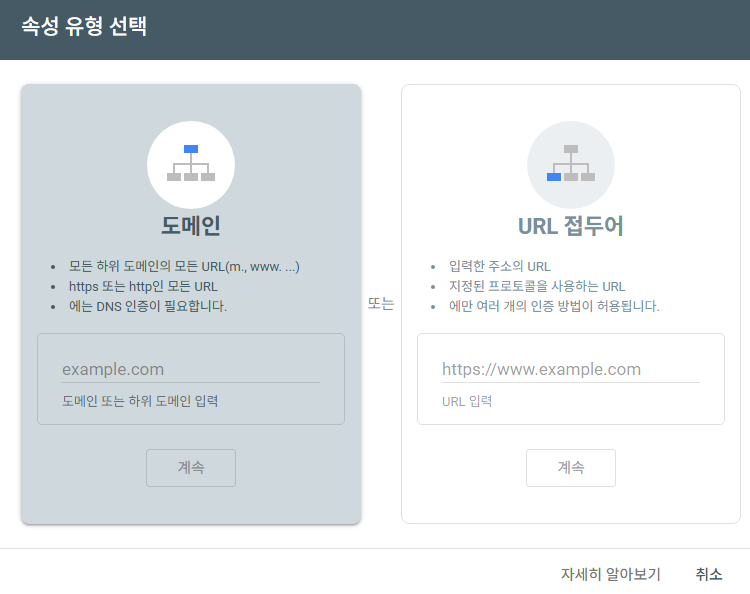서치콘솔에서 새 속성 추가 시 두 가지 중 고릅니다.