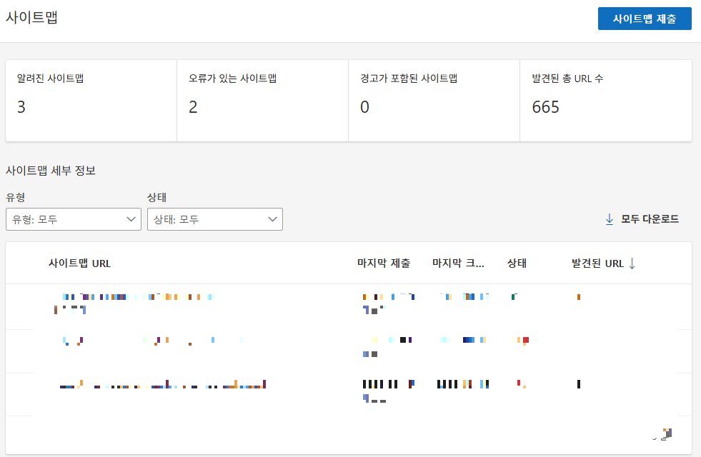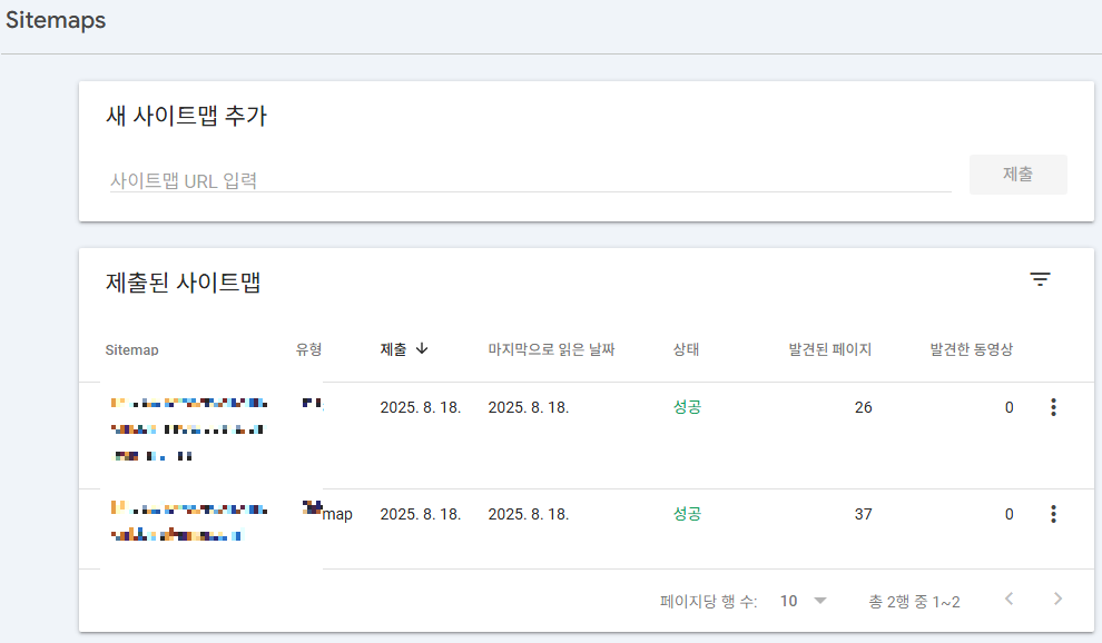 - 동일한 사이트맵 URL 제출 → 상태/처리 결과 확인