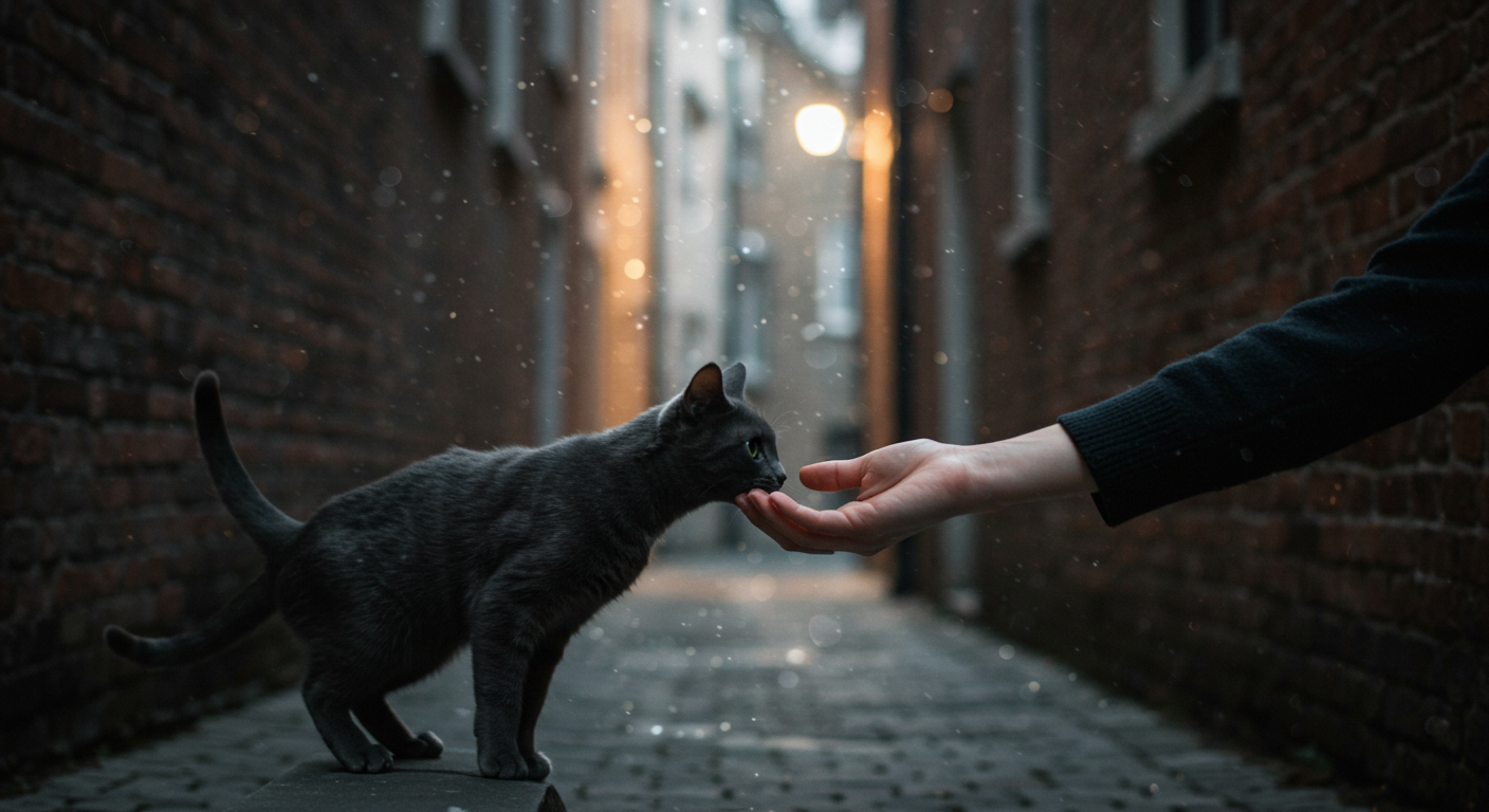 - “유리창 너머에서 검은 고양이가 다가와 손등을 무는 순간, 하이 콘트라스트, 시네마틱 라이팅, 4K”