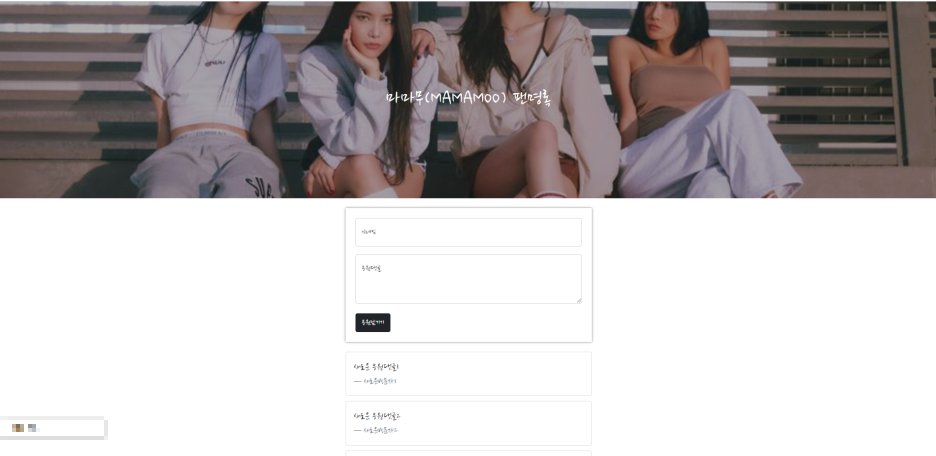 1주차 숙제는 주어진 예시와 같은 팬명록을 만드는것이 목표입니다. 꼭 십센치를 할필요는 없고 개인이 좋아하는 아티스트의 팬명록을 만들면 됩니다. 저는 마마무의 이미지를 이용해서 팬명록을 만들었습니다.