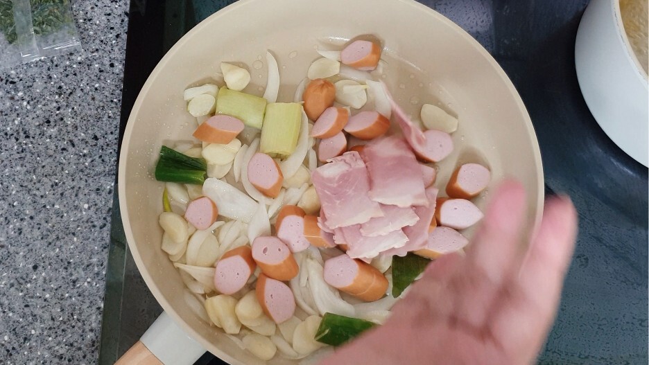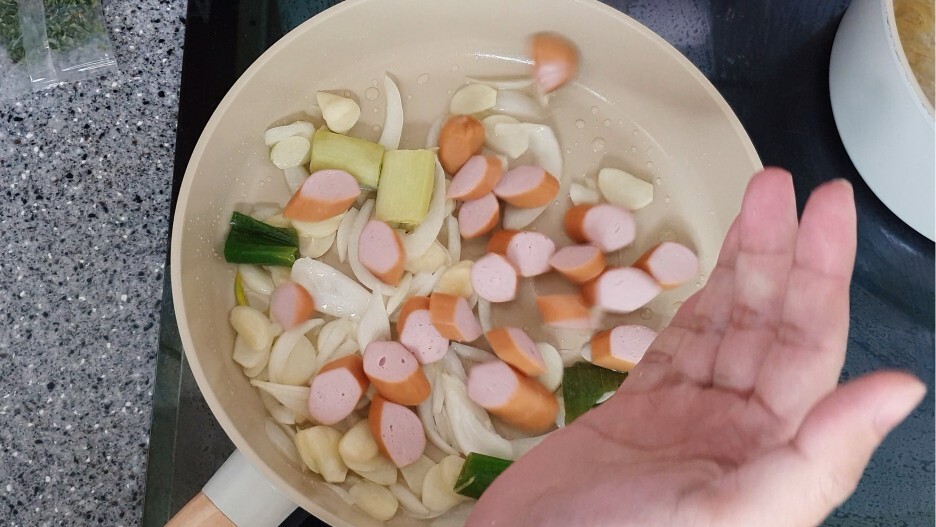 양파와, 파 그리고 마늘을 충분히 익혀준 후 미리 잘라둔 소시지를 팬에 넣습니다.