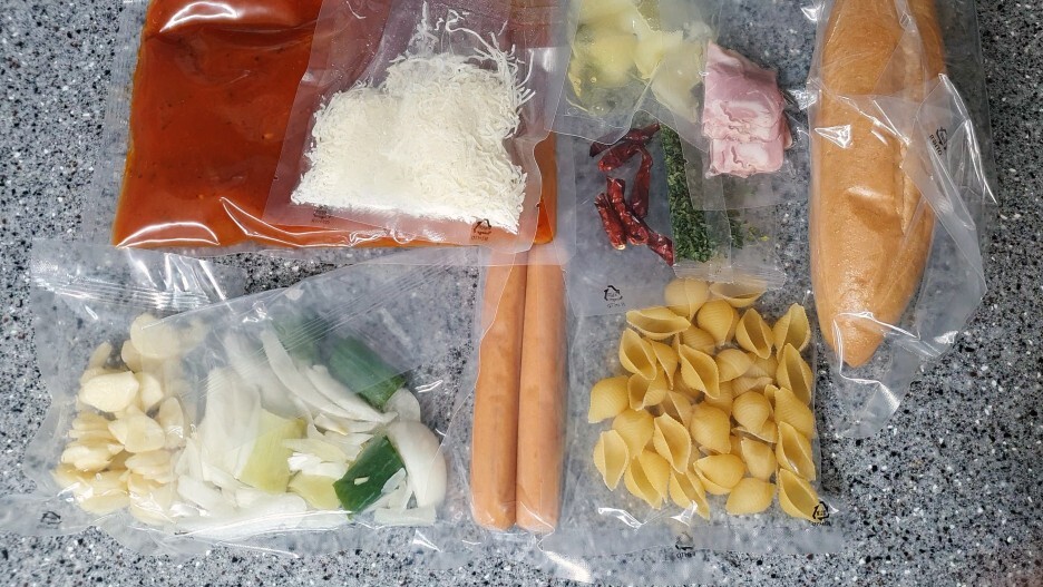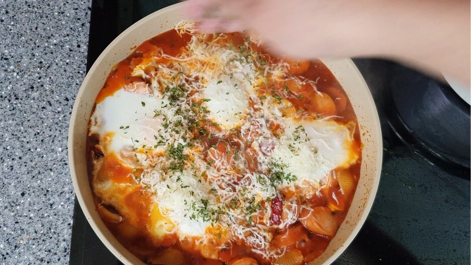 재료로는 마늘, 파, 양파, 소시지, 토마토소스, 눈꽃 치즈, 페페론치노, 파슬리, 오일, 베이컨, 파스타(콘킬리에), 빵이 들어가 있습니다. 그리고 사진에는 없지만 계란도 2개 들어있었습니다. 조리방법을 보니 팬 하나로 조리가 가능할 줄 알았는데 자세히 보니까 파스타를 삶아줘야 하기 때문에 작은 냄비도 하나 필요합니다. 에그인헬 조리방법은 다음과 같습니다.