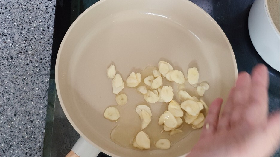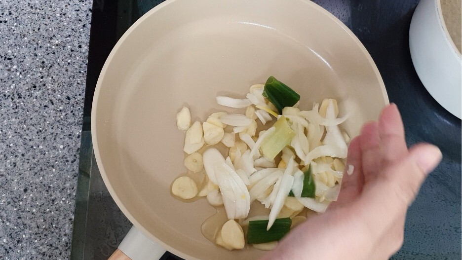 팬과 기름이 달궈지면 마늘과 양파, 파를 넣어주고 볶아줍니다.
