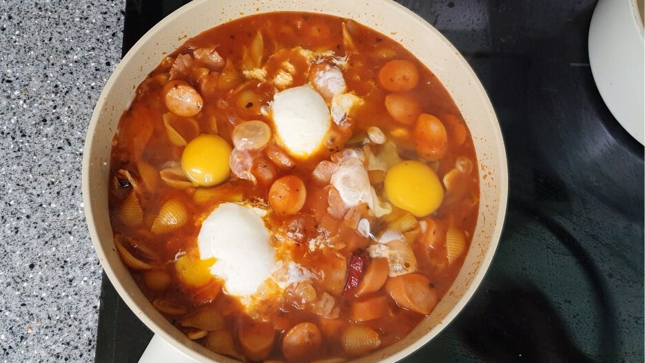 파스타를 넣어주고 끓여주다가 계란을 넣어줍니다. 계란이 두 개라고 했는데 사진에는 4개입니다. 흰색으로 보이는 것이 밀키트 안에 동봉되어 있는 계란입니다. 처음에는 날계란이라고 생각했는데 수란이 들어있더라고요. 그래서 저 같은 경우는 날계란을 넣어서 좀 오래 끓였지만 동봉되어 있는 수란을 넣는다면 오래 끓이지 않아도 될 거 같습니다.