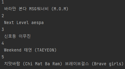 실행 결과의 일부입니다. 순위 부분이 상승 내용까지 함께 담고 있고 노래 제목에도 여백이 많은 것을 볼 수가 있었습니다. 그래서 순위에는 앞에 두 글자만 가져올 수 있게 text 뒤에 [0:2]를 더 붙였고 노래 제목에는. strip()를 이용해서 문자열의 공백을 지워줬습니다.