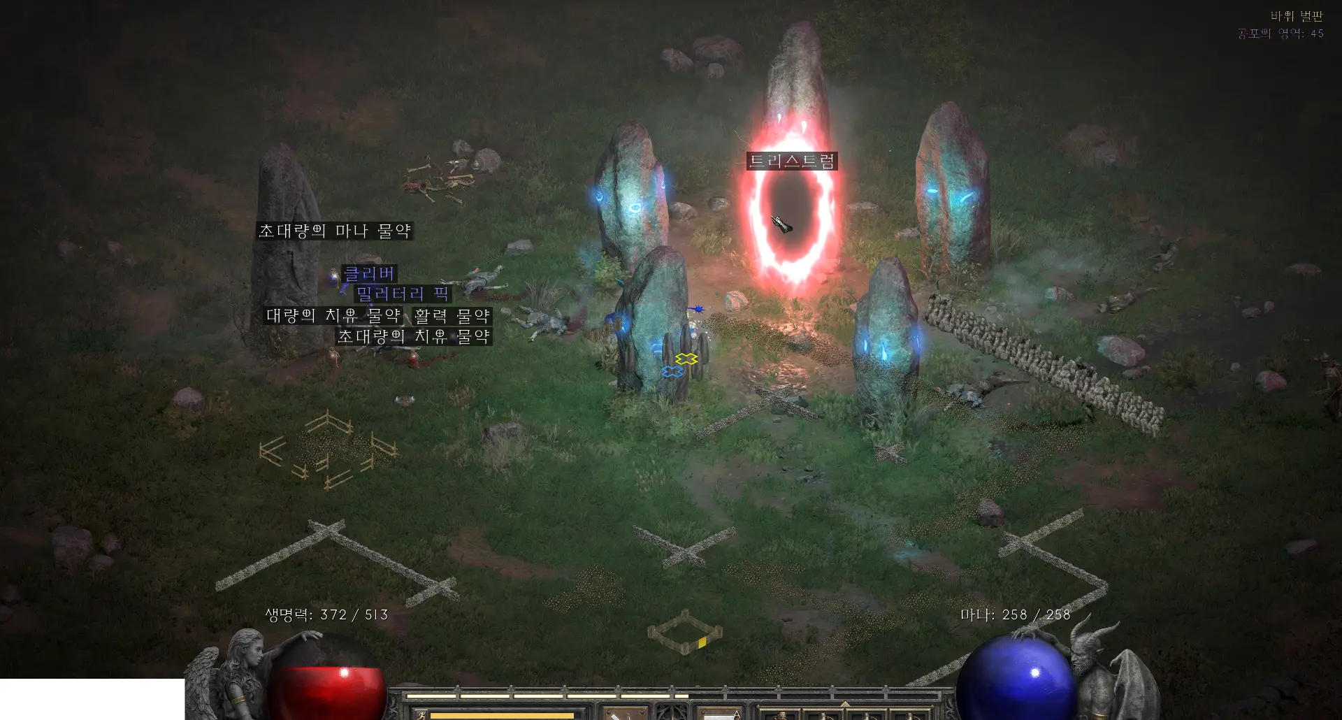 2단계 트리스트럼 포탈 열기 스토니 필드의 카언 돌을 해석 순서대로 활성화하면 붉은 포탈이 생성됩니다. 파티 플레이에서는 순서 공유가 필수입니다. 이 과정은 디아블로2 카우방 와트의 다리(Wirt’s Leg) 획득의 관문이므로 실수 방지가 중요합니다.
