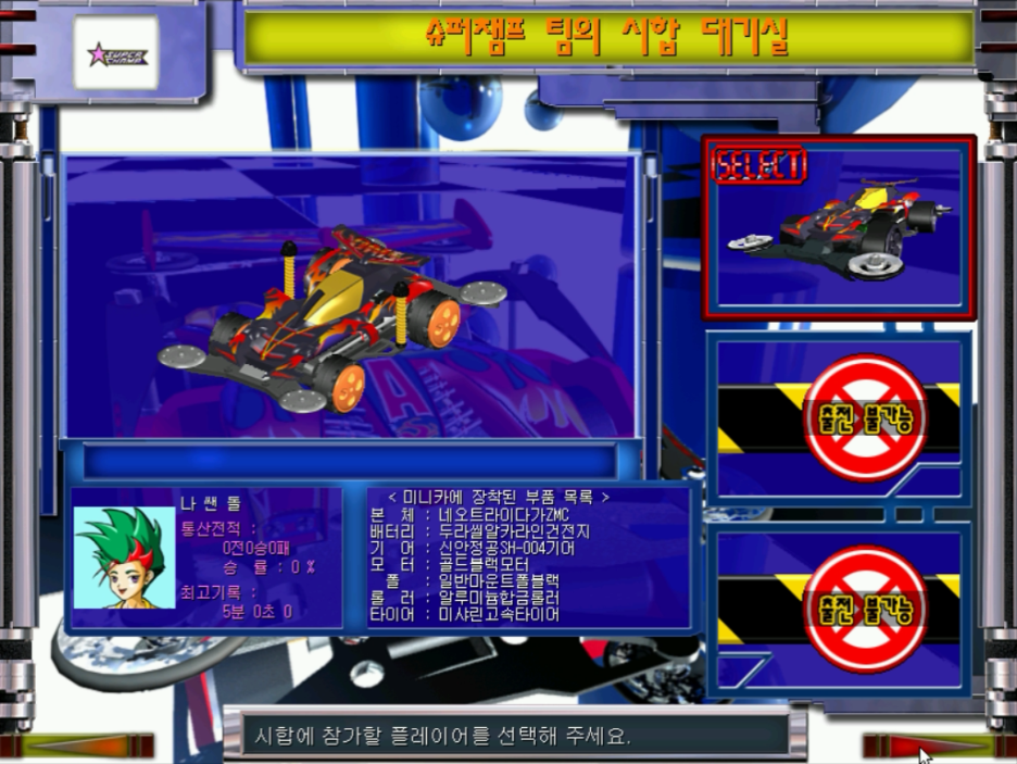 조립을 완료하고 경기장 중 하나를 선택해서 경기를 진행해 봤습니다. 하나의 기체만 조립했기 때문에 화면에 하나의 기체만 출전 가능할 수가 있고 미니카에 어떤 부품이 장착되어 있는지와 전적도 표시가 됩니다. 다음 화면으로 넘어가기 위해 버튼을 클릭합니다.
