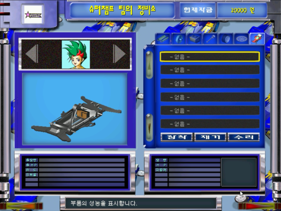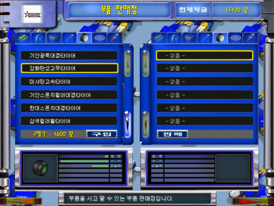 정비소에서 오른쪽 하단에 화살표를 클릭하면 부품 판매점으로 이동을 할 수가 있습니다. 전작과는 완전히 다른 화면을 보여주는데요. 텍스트 위주의 리스트를 만들고 그 아래에 부품의 모양, 성능을 볼 수 있게 바뀌였습니다. 부품을 하나씩 구입하여 조립을 해봅니다.