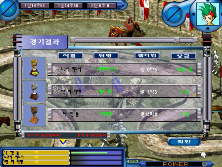 그래서 결국에는 꼴찌 했습니다. 뭔지도 모르고 꼴찌를 했네요. 전에 '영광의 챔피언 1'때처럼 다시 한 번 더 해볼까 생각을 했지만 이번에도 종료 버튼을 눌러주었습니다.