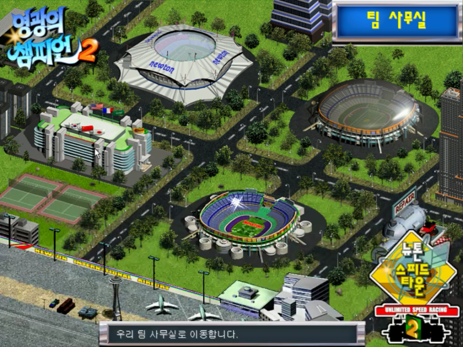 팀을 선택하고 다음으로 넘어오면 볼 수 있는 마을입니다. 전작에서도 마을 내에서 이용할 수 있는 곳이 별로 없었는데 이번 작품은 팀 사무실과 부품 상점이 한곳으로 합쳐지고 나머지 장소들은 전부 레이싱을 하는 장소로 이루어져 있습니다.