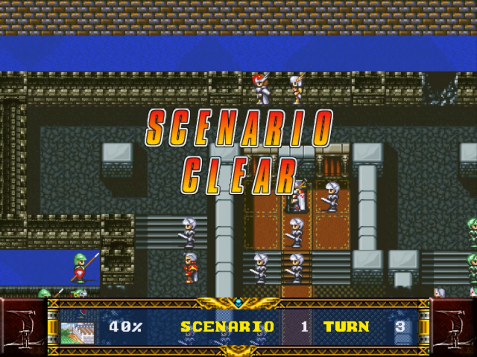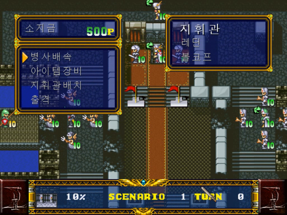 그 후 두 번째 오프닝을 보고 나면 시나리오 0-1이 시작됩니다. 시작부터 침략에 레딘은 도망을 가야합니다. 랑그릿사2를 먼저 해서 익숙한 그래픽이지만 1이 조금 더 투박한 느낌이 드네요. 조작 방법도 똑같아서 플레이하는 데는 낯섦이 없었습니다. 이번 시나리오는 주인공인 레딘을 맵 상단에 목표지점에 도달하는 것이 목표입니다. 첫 시나리오여서 그런지 큰 어려움은 없습니다. 단순하게 올라가면 되지만 레벨 업에도 신경을 써야 하기 때문에 적당하게 적들을 상대하면서 올라가는 것이 좋습니다. 제가 경험 바로는 전투를 피하면서 목표를 달성하면 낮은 레벨 때문에 다음 시나리오 그다음 시나리오에서 어려움을 겪게 되더라고요.