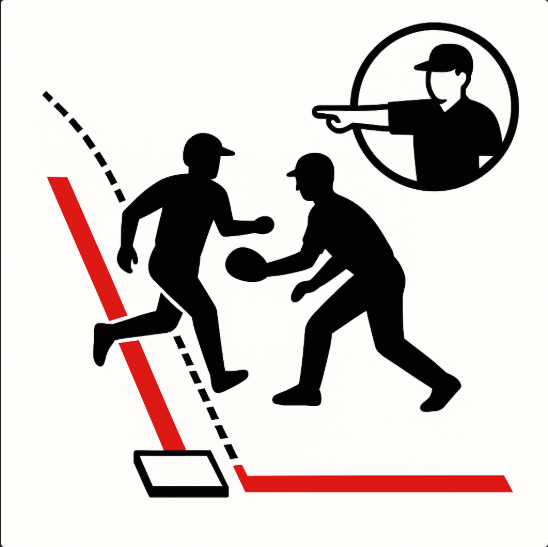 타자가 1루로 전력 질주할 때 라인 외측에 그어진 ‘러너 레인’(주루선 레인)을 벗어나 수비의 송구를 방해하면 야구 규칙 주루 방해가 됩니다. 레인 안쪽을 달리다 마지막 터치 순간만 베이스 안쪽으로 들어오는 것은 합법이지만, 레인 밖에서 어깨·팔로 송구 라인을 가리면 방해가 성립합니다.