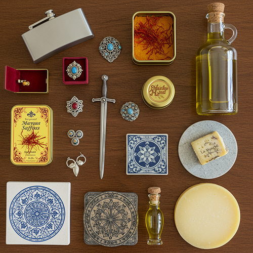 1. 다마스키나도 주얼리(귀걸이·브로치·펜던트) 2) 톨레도 검 미니어처 3) 장식용 단도(레터 오프너) 4) 수제 마르지판(마사판) 5) 올리브 오일 프리미엄 소병 6) 사프란(카사 데 사프란 등) 7) 가죽 소품(지갑·벨트·노트 커버) 8) 세라믹 타일·접시 9) 무데하르 패턴 코스터 10) 수제 초콜릿 11) 수제 비누·향초 12) 라 만차 와인(템프라니요 중심) 13) 치즈 만체고(소포장) 14) 엽서·자석·금박 책갈피 15) 톨레도 대성당 굿즈(가이드북·스노우볼)