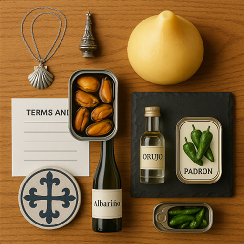 1. 순례자 조개껍데기(콘차) 펜던트·브로치 2) 보타플루메이루 향로 모형 3) 순례자 여권 커버·스탬프 세트 4) 테타 데 네그라도 치즈 소포장 5) 갈리시아 문어 통조림·보카데이로 6) 티토스 디 오루호 전통 리큐르 미니어처 7) 알바리뇨 화이트 와인 8) 갈리시아 꿀·밤꿀 9) 파드론 고추 절임·캔 10) 엠폴라도 사과 시드라 캔 11) 세드라 카트린 세라믹 접시·코스터 12) 슬레이트 코스터·트레이 13) 비 방수 우산·우비 14) 산티아고 대성당 일러스트 엽서·포스터 15) 로사리오·목걸이·성상 소형 굿즈