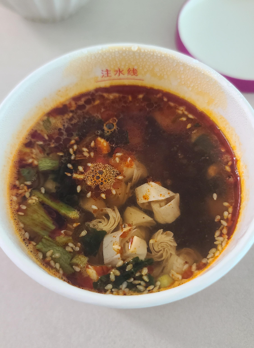 일반 컵라면이 밀가루 면을 쓰는 것과 달리 하이디라오 쏸라펀 컵라면은 고구마 전분 위주의 당면을 사용해 식감이 확연히 다릅니다. 당면을 적절히 불려주면 투명하고 탄력 있는 식감이 살아나 국물과 함께 후루룩 마시듯 먹기 좋죠. 게다가 산미가 분명해서 느끼함이 덜하고, 얼얼한 매운맛이 뒤에 따라오며 입맛을 깨워줍니다.