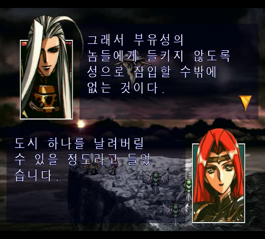 한편 부유성 밖에서는 알테뮬러가 부유성을 떨어뜨리기 위해 잠입을 준비하고 있습니다. 랑그릿사의 레온처럼 이번 작의 주인공 디하르트의 라이벌 상대입니다. 랑그릿사 대대로 주인공 라이벌들은 차가워 보이지만 뭔가 모를 따뜻함이 느껴지는 건 저뿐일까요?