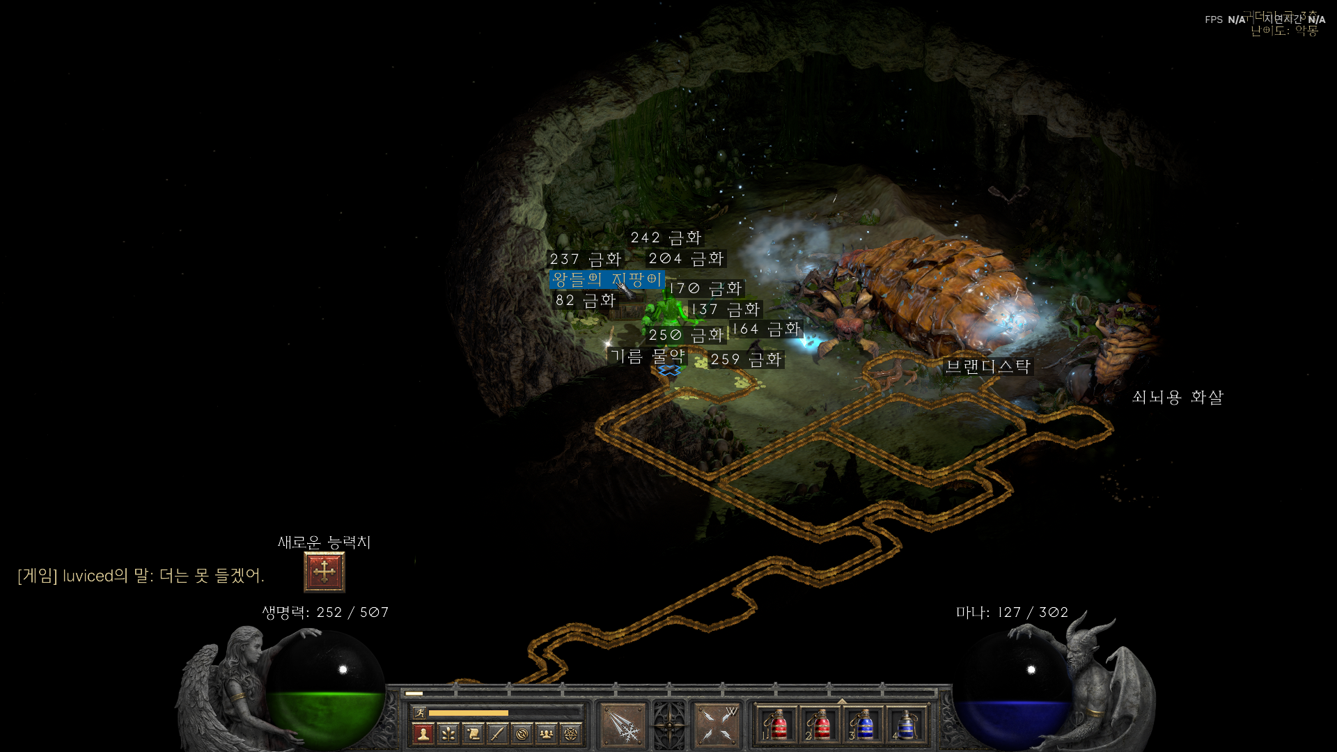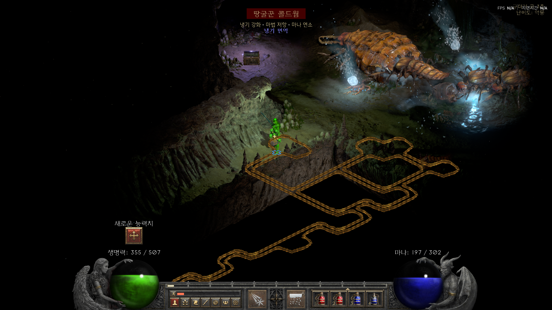 - 보스 정보 땅굴군주 콜드웜은 독과 냉기 피해를 동반합니다 독 해제 물약과 해제 주문서를 챙기면 안전합니다