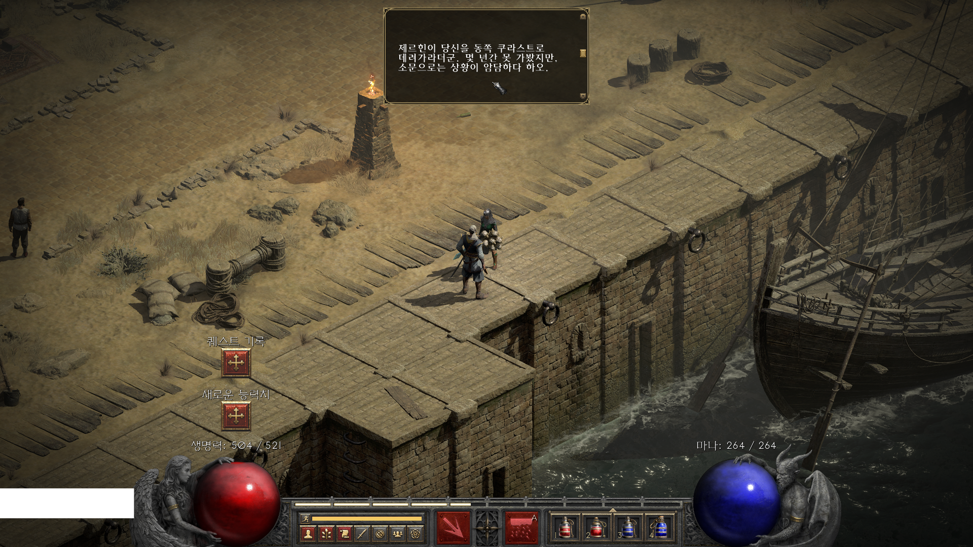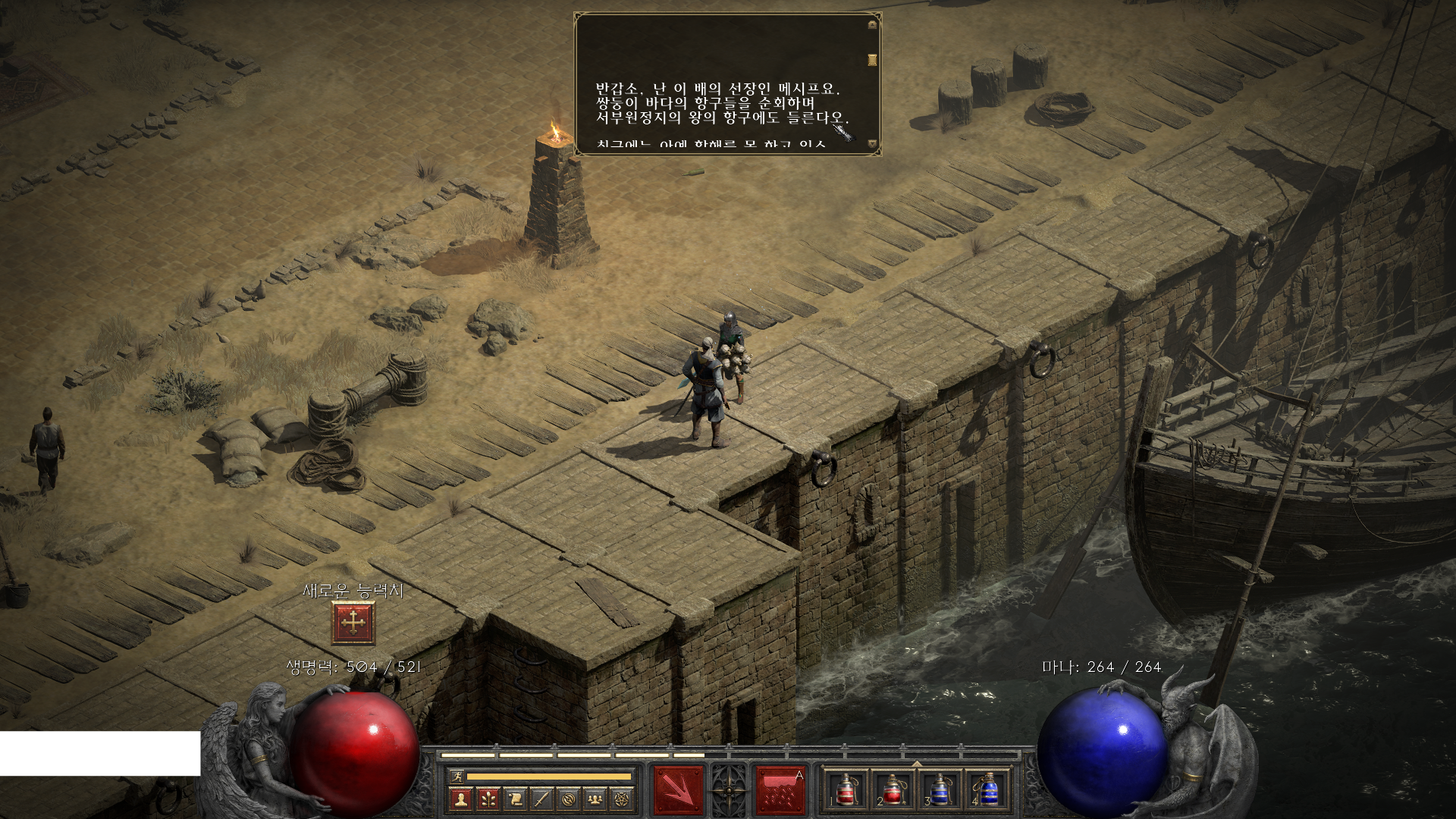 두리엘 처치 후 방 안에서 티리엘과 대화하면 이야기가 진행됩니다 마을로 돌아와 제르힌과 대화한 뒤 메쉬프의 배를 타고 액트3 쿠라스트로 이동할 수 있습니다 이 흐름을 미리 알아두면 디아블로2 레저렉션 액트2 6 퀘스트 공략 일곱개의무덤 이후 동선이 헷갈리지 않습니다.