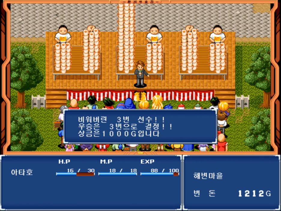 길을 떠난 첫 번째로 도착한 마을에서 먹기 대회 &마시기 대회가 진행 중입니다. 우승을 하게 되면 1000G를 받게 됩니다. 둘 중 아무것이나 참가해도 상관없지만 먹기 대회를 하는 것이 좋습니다. 그 이유는 이후에 알 수 있는데요.