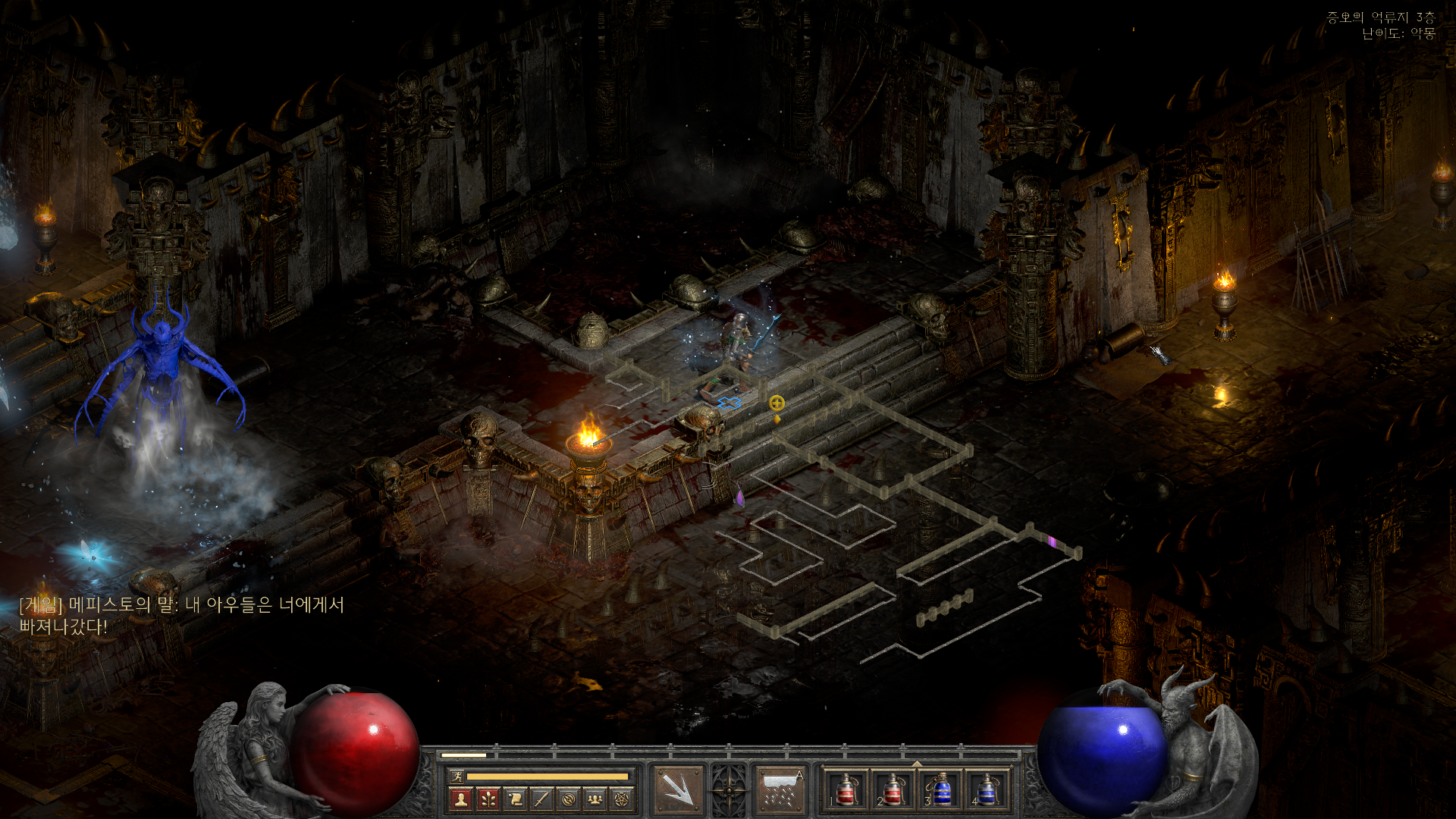 - 2단계 (강 건너기): 메피스토가 따라오는 것을 확인하고, 맵의 왼쪽이나 오른쪽 구석에 있는 '피의 강' 건너편으로 재빨리 도망칩니다. (순간이동이 가능한 소서리스는 매우 쉽습니다. 다른 직업은 빠르게 달려야 합니다.)