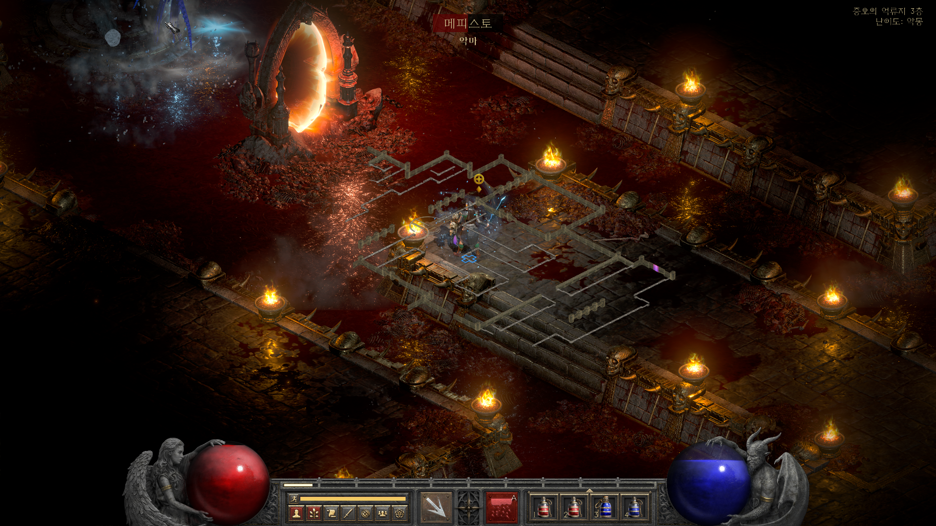 메피스토는 처음 도전할 때 매우 강력한 보스입니다. 여러 번의 트라이가 필요할 수도 있고, 나중에 아이템 파밍을 위해 '메피스토 앵벌'을 할 때도 이곳 순간이동진은 절대적으로 필요합니다. 액트3 6 퀘스트 공략의 핵심은 '효율'입니다. 3층으로 내려가는 입구를 찾기 전에, 반드시 2층의 순간이동진을 활성화하고 마을에 다녀오시는 것을 강력히 추천합니다.
