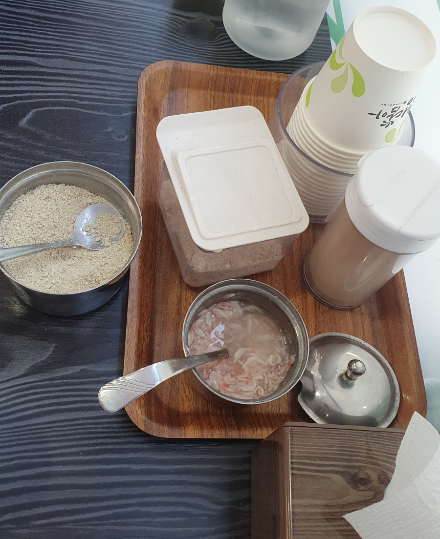테이블 한 쪽에는 들개가루, 새우젓, 소금, 후추가 있어서 기호에 맞게 넣어드시면 될 거 같습니다.